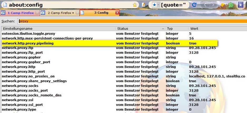 Bitte sagt mir zu allererst, wie ich die Einstellungen zu pipelining und proxy wieder rückgängig machen kann.