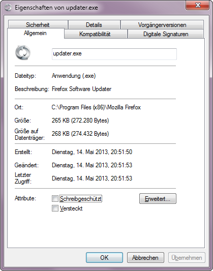 Das scheint aber die normale Updater.exe zu sein. Kann man das näher verifizieren? wie groß ist die regulär, 266KB?