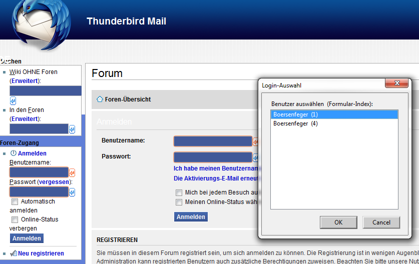 Das war ein guter Hinweis und ich kann das so für das Thunderbird Forum bestätigen. Genaugenommen ist es so: Auf http://www.thunderbird-mail.de/forum/ befindet sich nur ein Loginformular (links) und in SecureLogin gibt es dort auch keine Wahlmöglichkeit zwischen mehreren Einträgen. Öffnet man jedoch einen Link aus einer Benachrichtigungsmail (Link in etwa so: http://www.thunderbird-mail.de/forum/viewtopic.php?*) gibt es zwei Loginformulare: links und mittig auf der Seite.