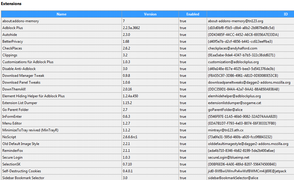 mein adblock plus deinstalliert sich bei jedem neustart vom fuchs bzw. das symbol verschwindet. neuinstall von adblock hat nix gebracht. nun will ich mein profil neu aufsetzen. hab ne liste der installierten add-ons exportiert, damit ich weiß, was ich neu installieren muss. einzelne add-ons hab ich selbst bearbeitet und für FF in den aktuellen versionen kompatibel gemacht ( z.B. Auto Context ). Ich wollte diese Erweiterungen nicht neu anpassen sondern einzeln sichern.