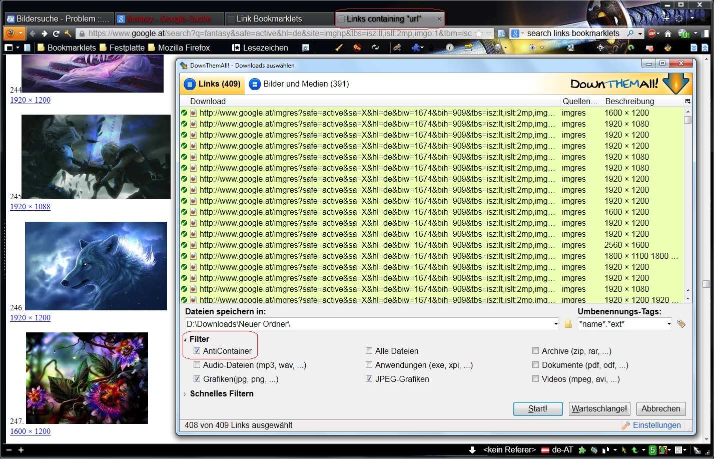 Nun, teste mit der Beihilfe vom Bookmarklet "search links" die 20 Bilder mit DownThemAll! (Filter eingeschaltet AntiContainer) herunter zu laden.