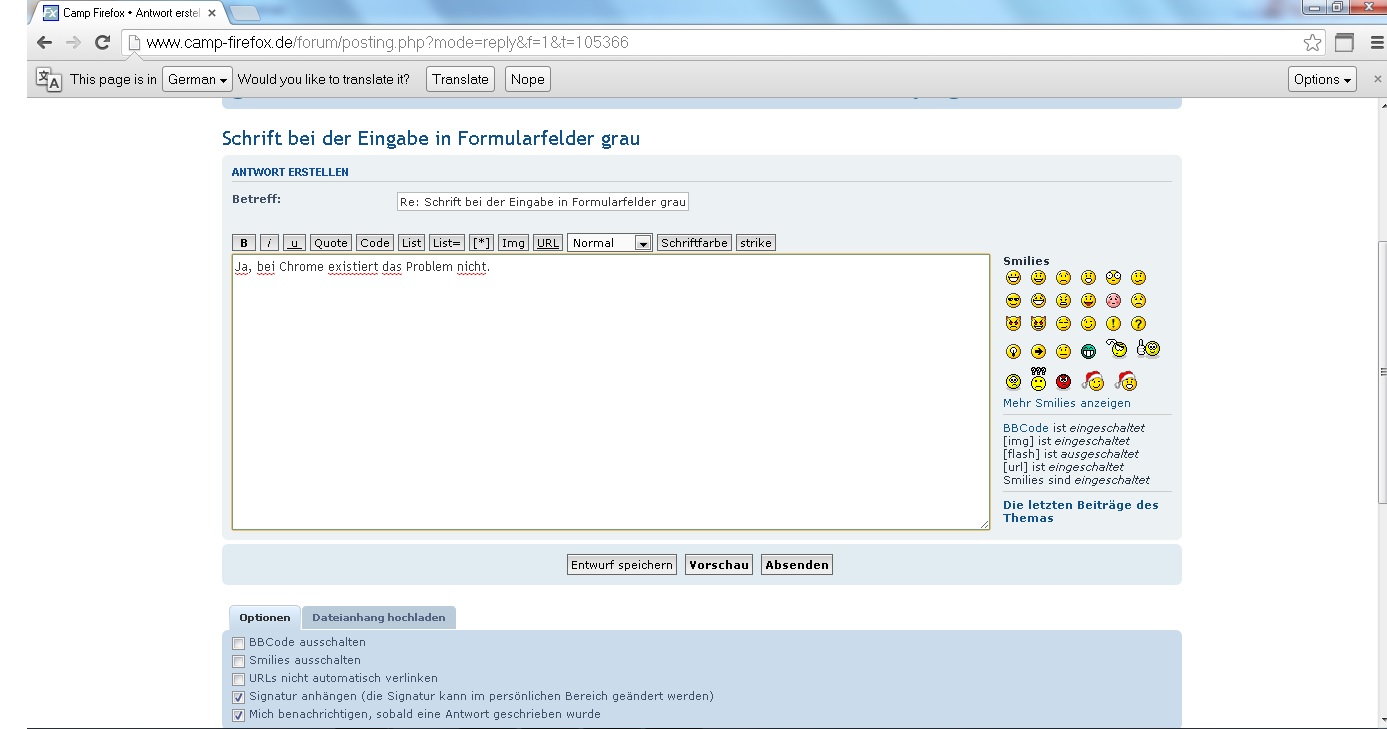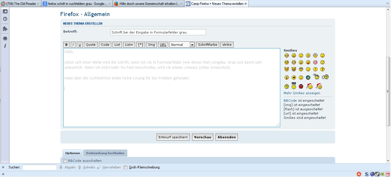 schon seit einer Weile wird die Schrift, wenn ich sie in Formularfelder (wie dieses hier) eingebe, Grau und damit sehr unleserlich. Wenn ich nicht mehr ins Feld reinschreibe, wird sie wieder schwarz (siehe Screenshot).