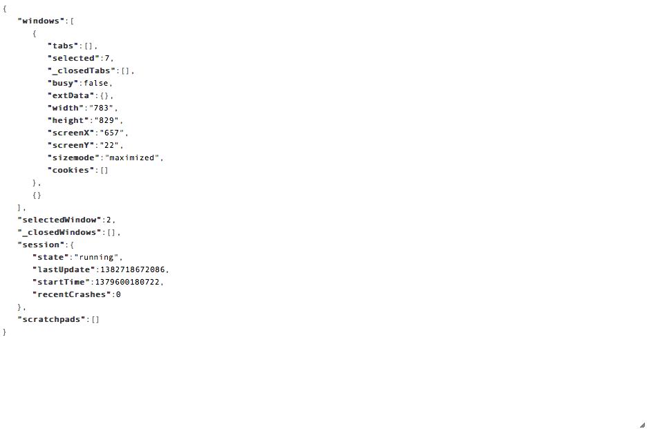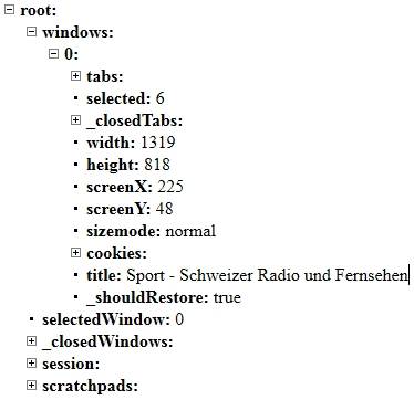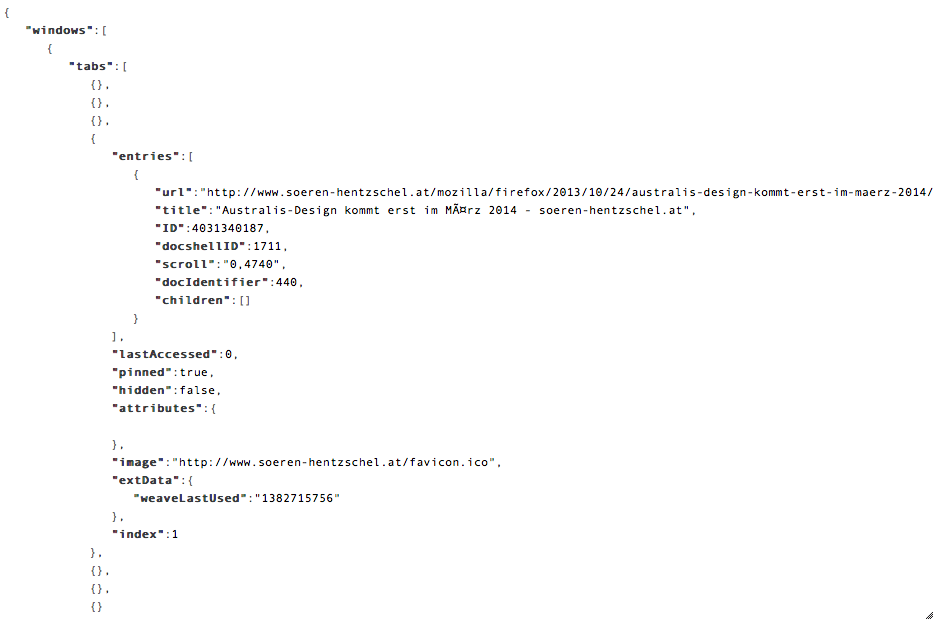 Und hier stehen in entries die interessanten Informationen. url und title sind wohl das, was dich am ehesten interessiert. Alles weitere kannst du komplett ignorieren, das ist die Zurück-Chronik, das sind Formulardaten, das sind Cookies, usw. Sogar deine Scrollposition wird sich pro Tab gemerkt.