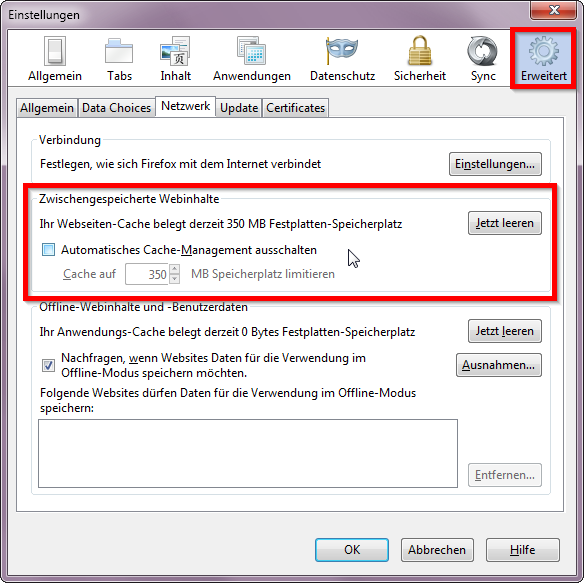 einstelle, wird gar kein cache mehr geladen. about:cache bleibt leer.