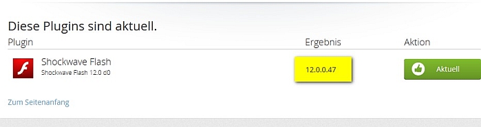 Übrigens, der Plugincheck sagt mir, dass die Version 12.0.0.43 aktuell ist.
