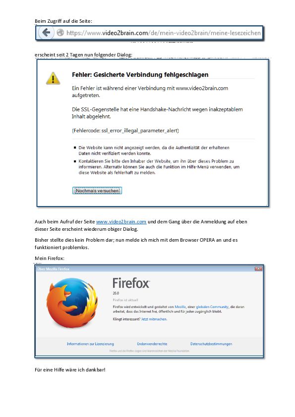 Seit 2 Tagen kann ich mich bei verschiedenen per https-gesicherten Seiten (http://www.video2brain.com & MyAccount von Kaspersky) nicht mehr anmelden; Fehlercode: ssl_error_illegal_parameter_alert; der Zugang über den Browser OPERA funktioniert.