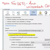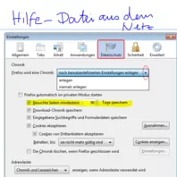 Ich verwende auf einem Windows 7 System Firefox 26.0 (angeblich tagesaktuell) und wollte heute (auch gemaess der Forenanleitung) durch Aenderung der Datenschutz-Einstellung die "Lebensdauer" meiner Chronik (die ich of fuer Suchen benoetige und in meinem Fall kein Sicherheitsrisiko darstellt) auf > 90 Tage einstellen.