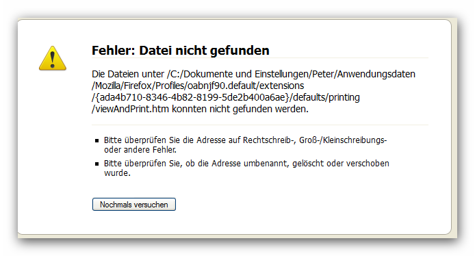 Bei jedem Start von FF wird folgender Tab geladen: file:///C:/Dokumente%20und%20Einstellungen/Peter/Anwendungsdaten/Mozilla/Firefox/Profiles/oabnjf90.default/extensions/%7Bada4b710-8346-4b82-8199-5de2b400a6ae%7D/defaults/printing/viewAndPrint.htm.