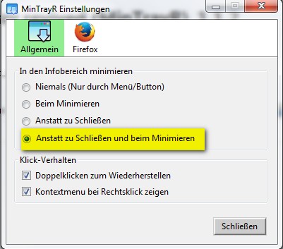 • Man könnte auch eine Erweiterung installieren und diese so konfigurieren das der Firefox beim Klick auf das Kreuz in den Systray minimiert wird.