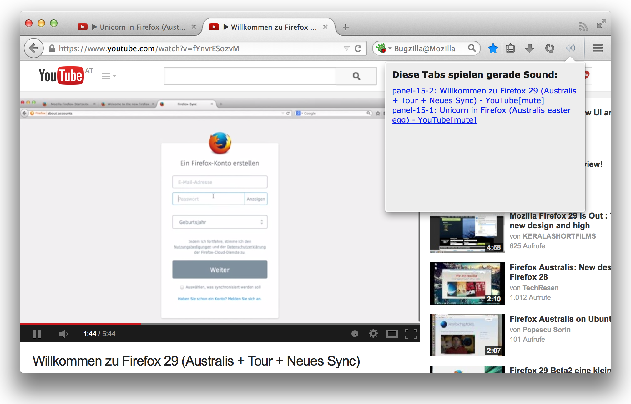 Wie man sieht fehlt es vor allem noch am Design. Die Hauptfunktionalität steht bereits. Am Symbol selbst ist bereits erkennbar, ob irgendeiner der Tabs Geräusche macht oder nicht, man muss also dafür nicht extra das Panel öffnen. Per Klick lässt sich zum jeweiligen Tab springen. Nächste zu erforschende Schritte: Den Ton für einzelne Tabs aus dem Panel heraus per Knopfdruck abstellen und die Lautstärke pro Tab regeln.