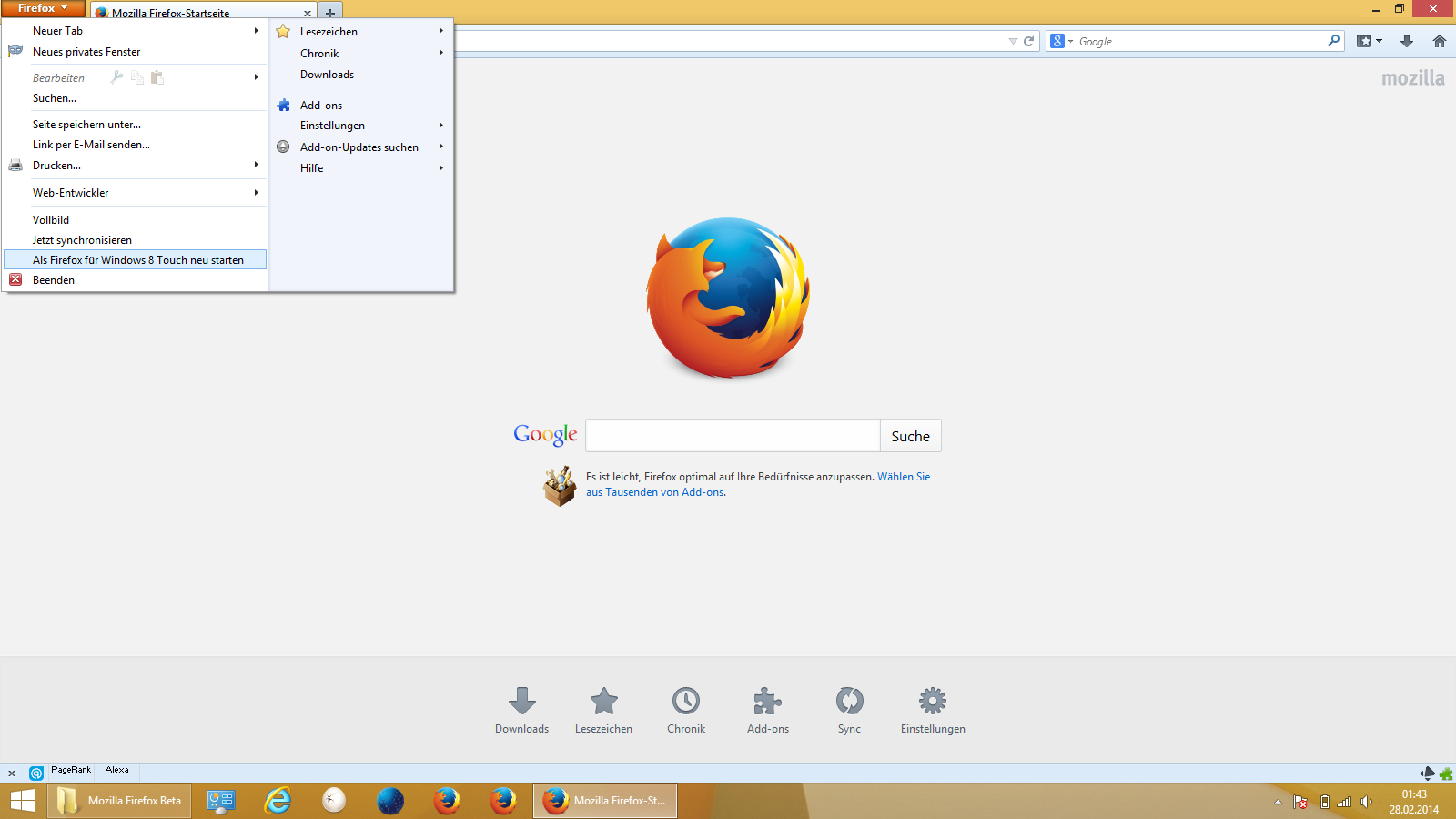 stelle sicher, dass du die aktuellste Beta-Version von Firefox 28 besitzt und wähle dann aus dem Menü den Eintrag "Als Firefox für Windows 8 Touch neu starten".