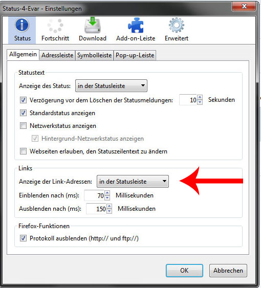 im Screen sieht man wie ich das AddOn eingestellt habe und zwar, soll der LinkText in der Statuszeile sein was aber nicht Funktioniert.