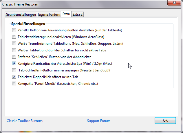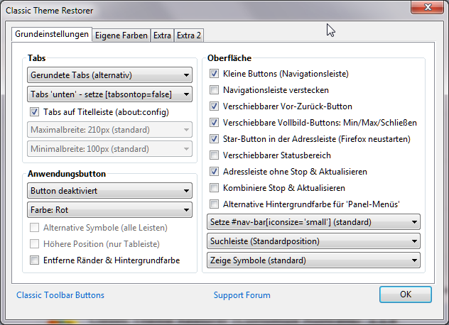 Ansonsten habe ich nur die Erweiterung Classic Theme Restorer genutzt mit diesen Einstellungen: