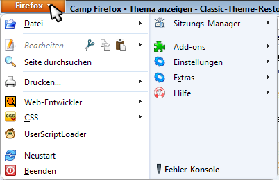 Damit kommen im Menü ein Eintrag für Neustart und zwei Buttons hinzu.Code Alles anzeigen// CTR-Firefox-Menü anpassen 1 (function () { if (location != 'chrome://browser/content/browser.xul') return; var menuitem = document.createElement('menuitem'); menuitem.id = 'appmenu_restart'; menuitem.setAttribute('label', 'Neu starten'); menuitem.setAttribute('oncommand', 'Application.restart()'); var refitem = document.getElementById('sync-setup-appmenu'); refitem.parentElement.insertBefore(menuitem, refitem.nextSibling); var pane2 = document.getElementById('appmenuSecondaryPane'); var spacer = document.createElement('spacer'); spacer.setAttribute('flex', '1'); pane2.appendChild(spacer); var hbox = document.createElement('hbox'); pane2.appendChild(hbox); var menuButtons = ['print-button','test-button']; setTimeout(function() { for (var id of menuButtons) { var button = document.getElementById(id); if (!button) { window.CustomizableUI.addWidgetToArea(id,'nav-bar'); button = document.getElementById(id); }; hbox.appendChild(button); }; }, 0); }) ();