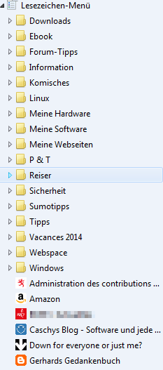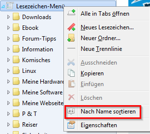 Nach dem Import der Bookmarks vom IE werden diese in der Sidebar so dargestellt , dass Ordner und einzelne Bookmarks alphabetisch sortiert , aber gemischt angezeigt werden. Ich hätte gern die einzelnen Lesezeichen unter den Ordnern angezeigt.In der Lesezeichen Funktion wird dies nicht angeboten. Gibt es eine Möglichkeit , evtl ein Plugin, um dies zu erreichen ?
