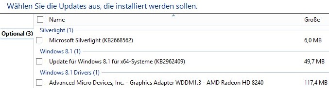 Rechts solltest du eine Infospalte haben mit mindestens zwei Links, solltest mal draufklicken... :idea: ist übrigens unter Win7 auch so. Ach ja, neben den Optionalen gibt es auch empfohlene, lässt sich auch speziell hervorheben bzw so einrichten, dass die empfohlenen bei den Optionalen auftauchen statt in der Hauptliste.