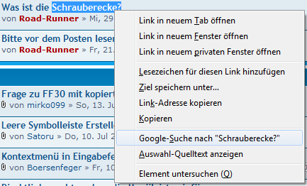 Kopiere ich jetzt den Text "Schrauberecke?" mit der Maus, mache einen Rechtsklick ->Google-Suche nach...
