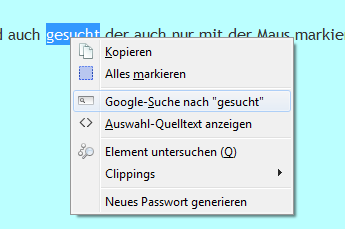 Mit Firefox 30 widerum wird schon im Fenster beim Rechtsklick mit der Maus der komplette Satz angezeigt bei Google-Suche nach... und dementsprechend auch komplett nach dem Satz gesucht obwohl man nur das eine