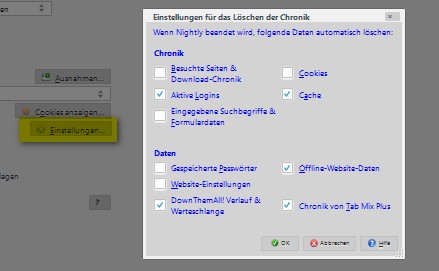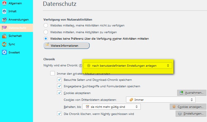 Dann wirst du deinen Firefox dauerhaft im Privaten Modus betreiben...es wird keinerlei Chronik angelegt, also auch keine Sitzungswiederherstellung ermöglicht. Ggf. sind die Einstellungen auf den Screens dann für dich besser geeignet... (Möglicherweise sieht das bei dir anders aus, Bilder vom Nightly mit diversen eigenen Codes, die Einstellungen sollten aber zumindest ähnlich sein)