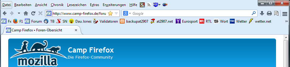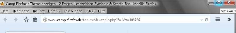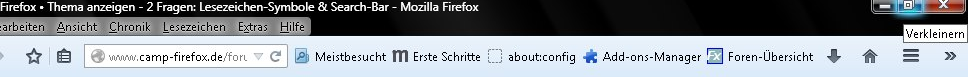 1. Die Lesezeichen-Symbole habe ich so eingstellt, dass sie in der Leiste mit der URL angezeigt werden. Wenn ich das Fenster etwas kleiner mache, verschwindet die Leiste aber leider (siehe Bildanhang). Ich hatte darüber durch Zufall einmal hier gelesen, kann den Faden aber nicht mehr finden. Damals hieß es wohl, es sei ein Bug nach der neuen Oberflächeintegration. Kann man das Problem irgendwie lösen? Es vergrämt mir den Firefox nahezu vollkommen - vor allem auch, weil es mir unverständlich ist, warum die Raum durch eine scheinbar unendlich langgestreckte URL Leiste gefüllt wird, die ich in dieser Länge niemals brauche.