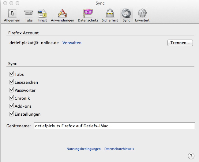 Gute Anleitungen gefunden: "im Menü „Firefox“ die Option „Einstellungen“ und dort „Sync“ auswählen. Es folgt ein Klick auf den Link „Gerät verbinden“...... Den aber gibt es bei mir nicht!? Habe einen Mac und eine Dose syncronisieren können, kein Problem. Jetzt wollte ich vom Ipad aus den Foxbrowser hinzufügen. Aber da ist kein Link auf Mac oder PC in den Einstellungen.