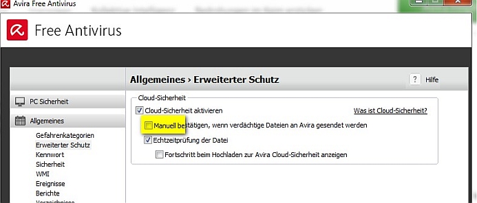 Wer die Kontrolle behalten möchte (so wie ich) lässt das manuelle Hochladen aktiviert. Generell ist die Cloud ein wichtiger Bestandteil der Antivirensoftware von Avira geworden und sollte nicht deaktiviert werden.