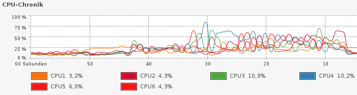Dass die HWB nicht zum Tragen kommt, lässt sich auch gut an der dann ansteigenden CPU-Last erkennen. Leider benutzt der Firefox nur einen Core.