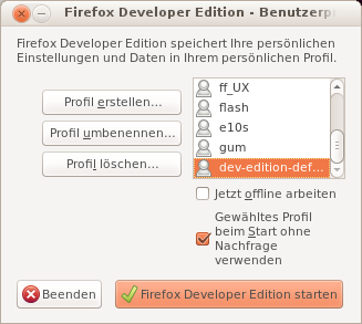 • Ich betreibe 5 Firefoxversionen und nutze 6 Profile... für jede Version eines und ein Testprofil.