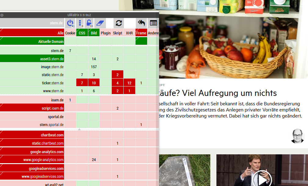 In uBlock habe ich keine Möglichkeit gefunden, ohne das Layout zu zerschießen... in uMatrix allerdings reicht es die Scripts für static.stern.de auf rot zu stellen... wenn ich dich richtig verstehe möchtest du allerdings das nicht für jede Seite einstellen, sondern einen Filter der allgemein gültig ist... ich wüsste derzeit nicht, wie dieser aussehen soll... die Anbieter schlafen auch nicht auf dem Baum... anscheinend finden die diese Wechselei ganz toll... Ich für meinen Teil besuche solche Webseiten nicht mehr.[attachment=0]Stern.de.png[/attachment]