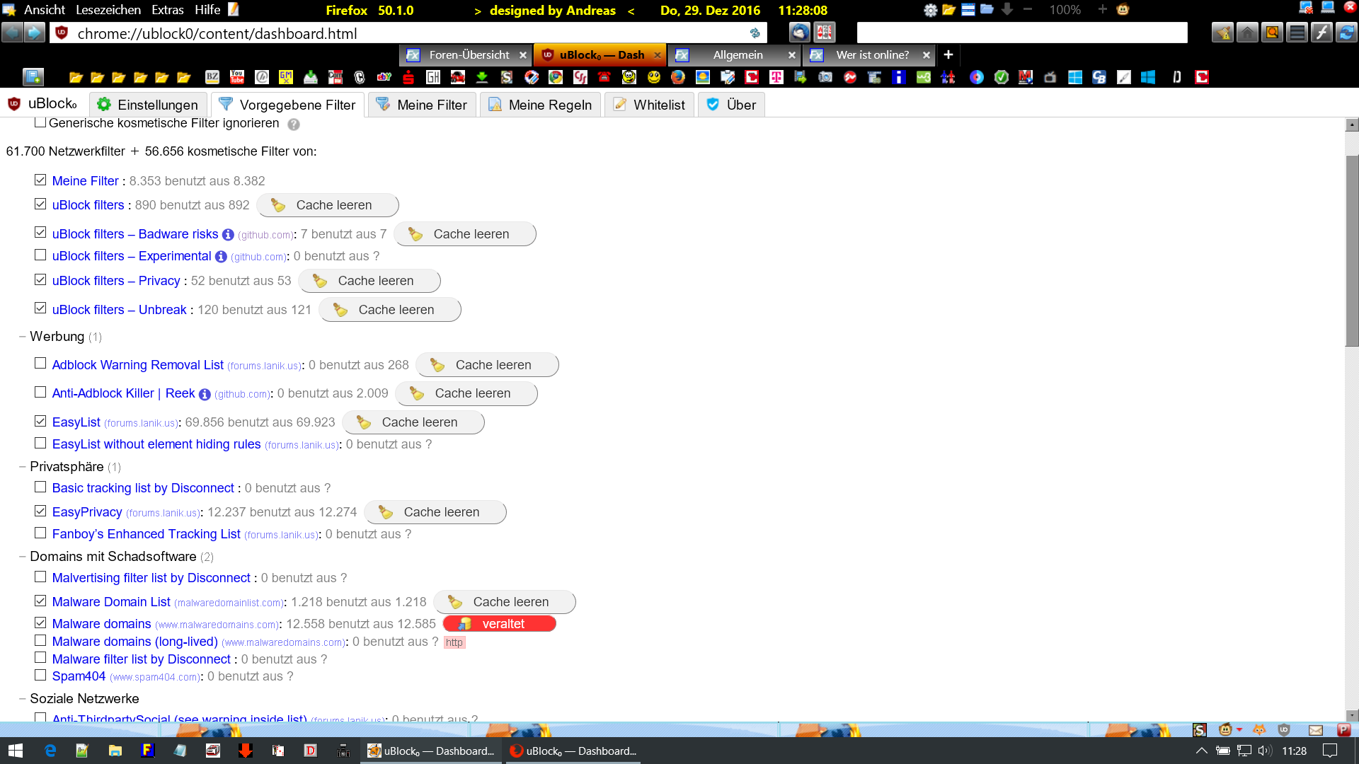 P.S. Was ich komisch fand/finde, dass ich ublock erneut ertappt habe dass er gar nicht eingeschaltet war. D.h. ich mußte ihn jetzt nach dem einfügen der neuen Filter + FF danach geschlossen und wieder gestartet -erneut einschalten...Ich meine, vielleicht war er die ganzen male Aus und ich fragte mich wieso dieses Feld immer wieder kommt. Muss ich beobachten.. :-??
