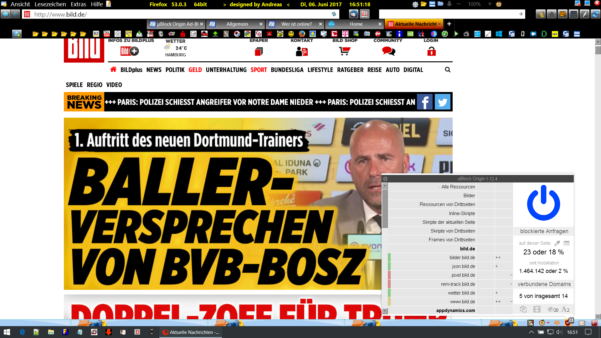 Also morgen deinstalliere ich Ghostery als erstes und gebe Bescheid. Ich teste auch ein neues sauberes Profil nur mit ublock am Board. Versprochen! Morgen gebe ich euch Bescheid.