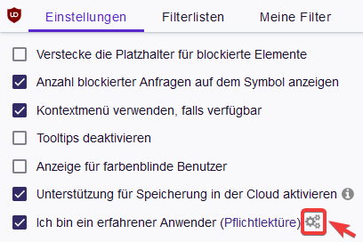 Boersenfeger Die erweiterten Einstellungen von uBO findest du, wenn du auf das Icon mit den drei Zahnrädern klickst, welches sich rechts neben der Option Ich bin ein erfahrener Anwender befindet.