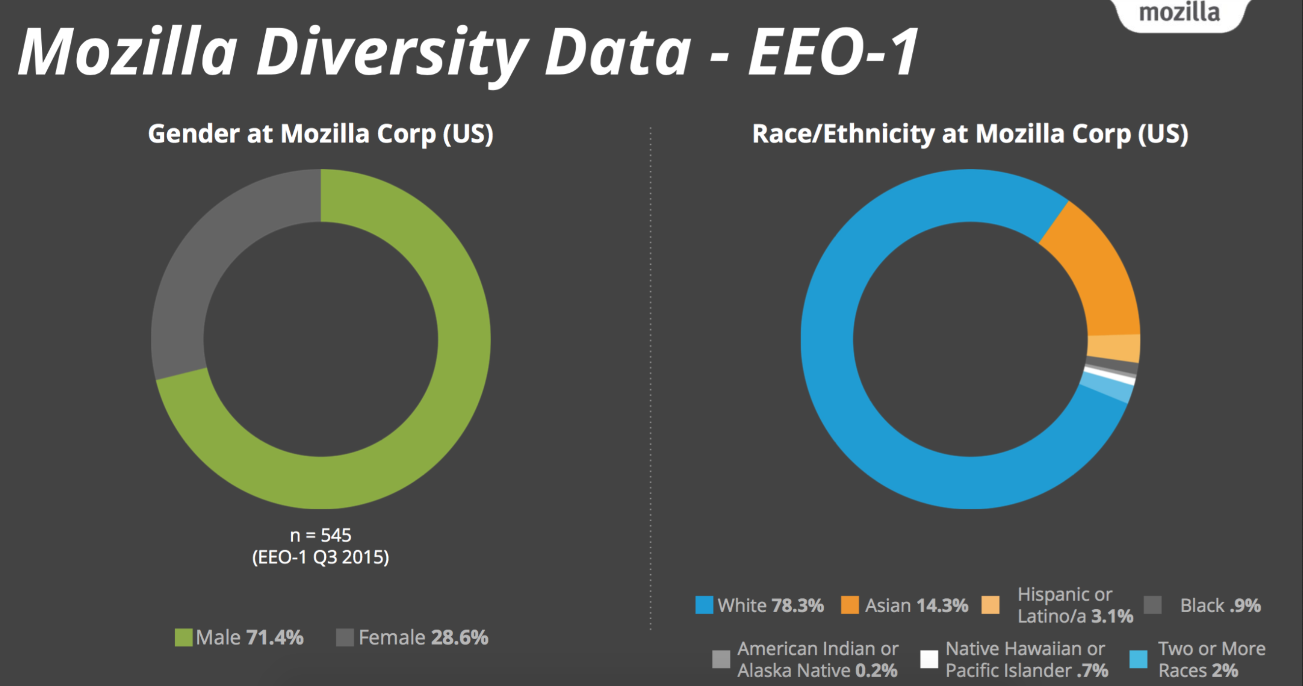 Der Thread ist schon etwas älter, aber ich habe darauf nun eine Antwort. Der Frauenanteil bei der Mozilla Corporation (schließt die Mozilla Foundation nicht mit ein, aber Firefox-Entwicklerin ist ja auch die Corporation und nicht die Foundation) beträgt 28,6 Prozent. Das sind natürlich nicht nur Entwickler, aber ich bezweifle, dass man eine detailliertere Statistik finden wird.