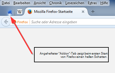 Habe dafür extra ein "jungfräuliches" Profil ohne jegliche addons angelegt. Habe den Addon-Tab mal "angeheftet". Beim ersten Start von Firefox erkennt man danach auf diesem Minireiter eine helle Schattierung im unteren Bereich (s. screenshot). Erst nach dem ersten Aufruf des Addon-Tabs verschwindet diese Schattierung wieder und bleibt solange weg, bis Firefox nicht geschlossen wird. Beim nächsten Neustart von Firefox ist er wieder vorhanden. Gibt es dafür irgendeine Erklärung ?