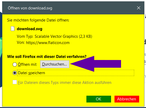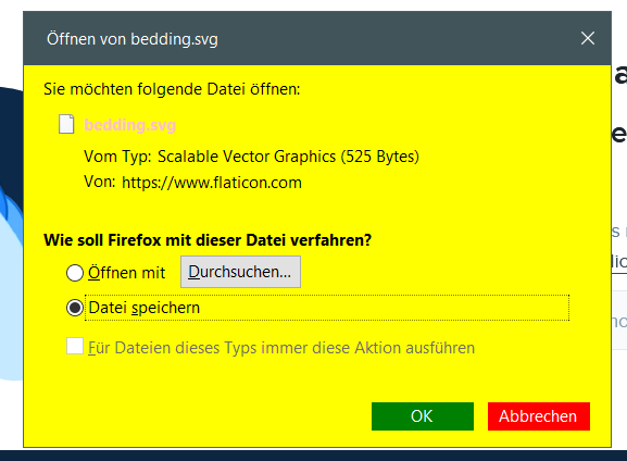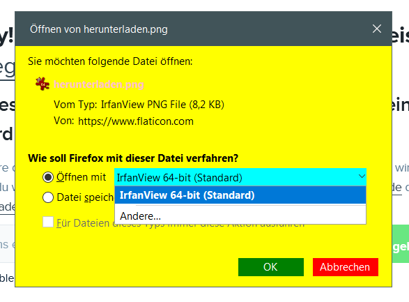 CSS Alles anzeigen/***************************************************************************************************/ /*************** Download-Fenster ** Datei speichern und öffnen mit **** einfärben *****************/ @-moz-document url(chrome://mozapps/content/downloads/unknownContentType.xhtml) { #openHandler{ -moz-appearance: none!important; min-height:20px!important; background:lightgreen!important; } dialog#unknownContentType{ background:yellow!important; } .dialog-button[label="Abbrechen"]{ -moz-appearance: none!important; color:white!important; background:red!important; } .dialog-button[label="Speichern auf"]{ -moz-appearance: none!important; color:white!important; background:dodgerblue!important; } .dialog-button[label="Datei speichern"], .dialog-button[label="OK"]{ -moz-appearance: none!important; color:white!important; background:green!important; } }Sieht dann so aus: