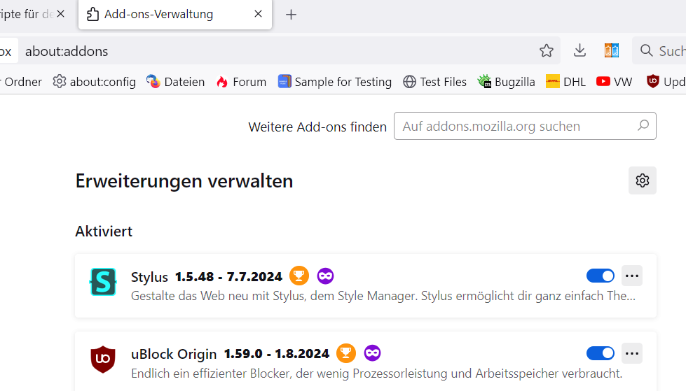 Anscheinend muss es auch ein Benutzerskript about-addons-verbose.uc.js oder so ähnlich geben, das in Zeile 52 eingelesen wird. Oder ist das der Name dieses Skriptes? Dann sollte es aber auch ganz oben angegeben werden, sonst funktioniert das Skript nicht, wenn man es unter einem anderen Namen abspeichert.
