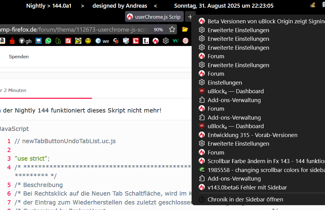 • Mod custom_scrollbars.uc.js. Dies ist eine ganz kleine Änderung am Skript von Aris-t2, jetzt funktioniert das Skript vollständig und problemlos in Firefox 143+ (Gradient-farbe, Pfeile usw.). Die Version von Aris-t2 auf GitHub funktioniert nicht in Firefox 142 und 143.
