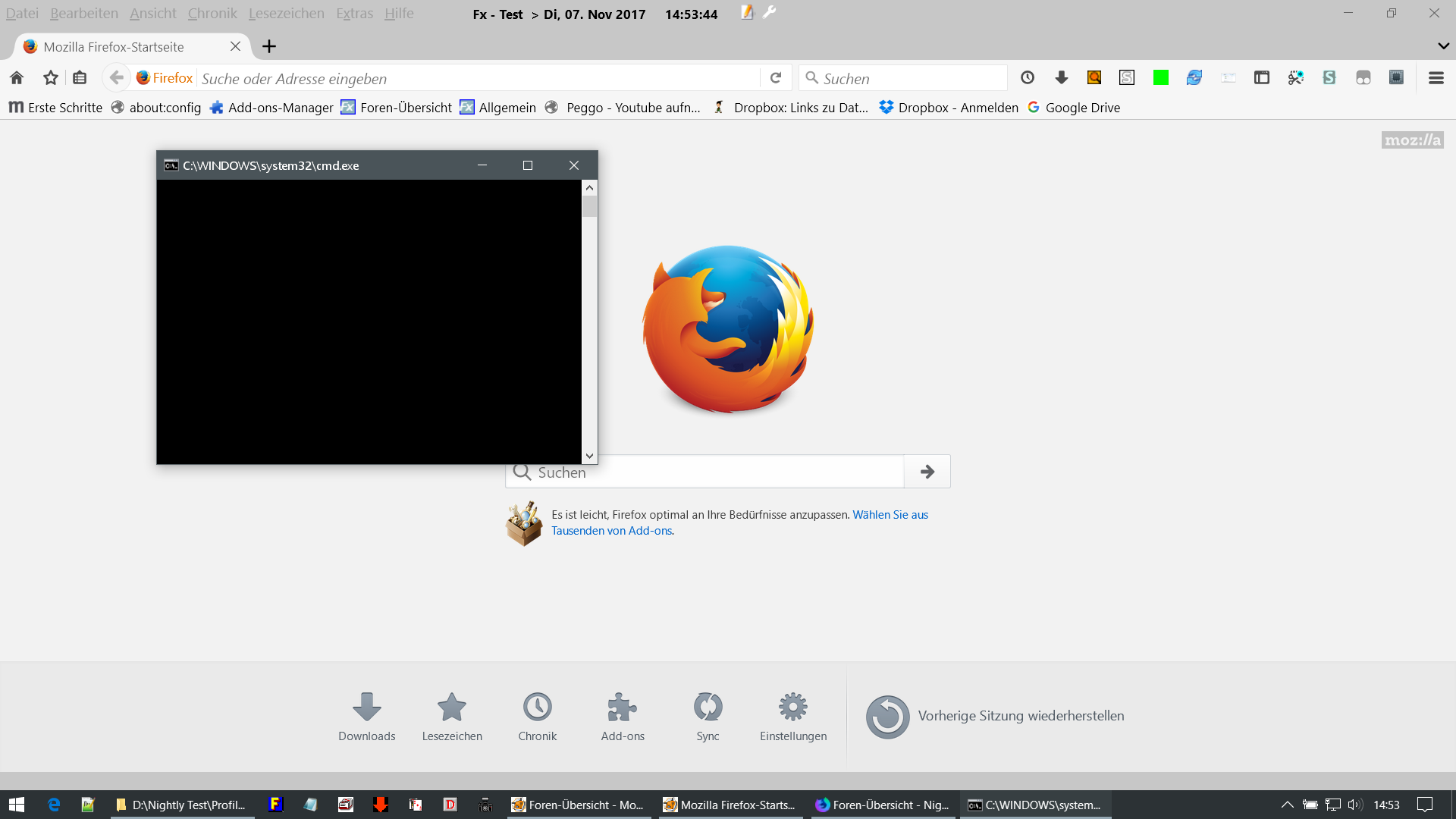 Wenn ich obigen Code eintrage öffnet sich zwar das Profil "Test", aber es kommt der Hinweis dass Firefox auf die Nightly Version umgestellt wurde. Nach einem Neustart dieses Profiles ist davon aber nichts mehr zu sehen.