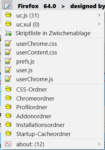 ich habe mir das Skript appmenu.uc.js https://github.com/Endor8/userChr…8/appmenu.uc.js mit einem Skript, mit dem ich das CTR-Menü verändern konnte und das im Wesentlichen von aborix kommt, erweitert: