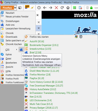 Die Buttons für Extension Options Menu und UserCSSLoader und Einträge aus der Menüleiste ins Appmenü eingefügt.