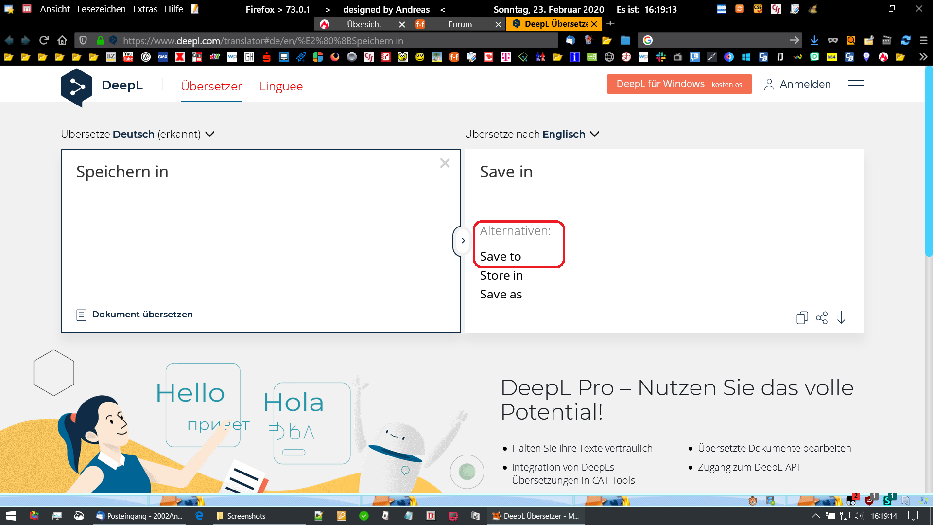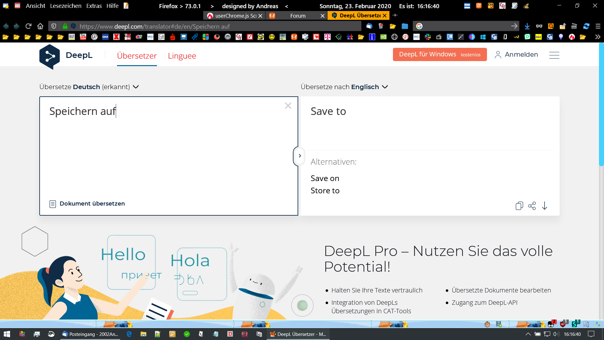Das mit Speichern auf oder in kann jeder halten wie er möchte. Mich hat erst Andreas hier RE: userChrome.js Scripte für den Fuchs (Diskussion) zum Nachdenken angeregt, und ich finde auch, dass es logischer ist. Speichern in Patition c / in Hauptordner x / in Zwischenordner y / in Zielordner 99. Nun setze mal auf für in ein, da wäre m.M.n. nur noch auf Partition i.O. Aber wie immer, jedem das Seine. :)