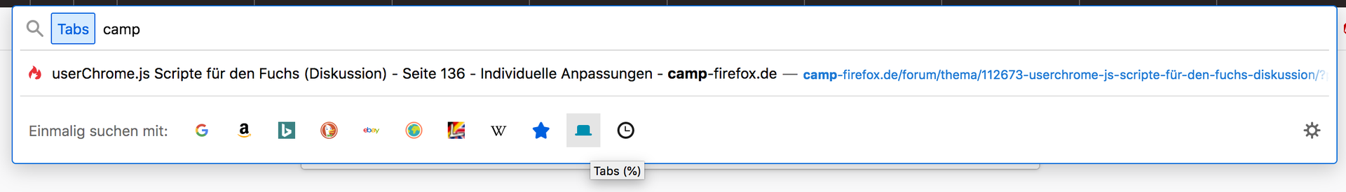 Was nicht funktioniert, ist "$" als Filter. Das hat aber nichts mit dem Skript zu tun, weil es auch nicht bei manueller Eingabe funktioniert. Dann sollen eigentlich alle Seiten angezeigt werden, die den Suchbegriff in der URL haben ( https://support.mozilla.org/de/kb/autoverv…ungen-vornehmen ), es wird aber nichts angezeigt. Kann das jemand bestätigen oder verstehe ich das falsch? Ich denke, dass dann alle Seiten aus Lesezeichen, Chronik und offenen Tabs angezeigt werden (wenn in den Sucheinstellungen aktiviert), die den Suchbegriff in der URL haben. Weiß Sören Hentzschel Rat?