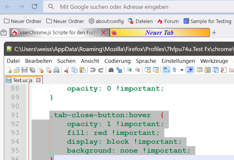 Das ist so, Andreas. Inder userChrome.css gibt es damit ja auch keine Probleme. Da wird dann bei hover auch das Kreuz mit color: red in dieser Farbe gezeigt. Aber nicht im Script, und das kann ich immer noch nicht verstehen.