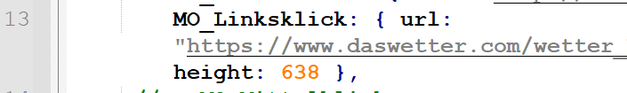 JavaScriptMO_Linksklick: { url: "https://www.daswetter.com/wetter_Neustadt+in+Sachsen-Europa-Deutschland-Sachsen--1-27120.html", width: 800, height: 638 },Ich habe hier MO_Mittelklick in MO_Linksklick geändert. Man kann für MO_Linksklick eine zusätzliche Zeile einfügen, aber ich habe bei Verwendung eines Linksklicks keine Verwendung für MO_MIttelklick mehr.