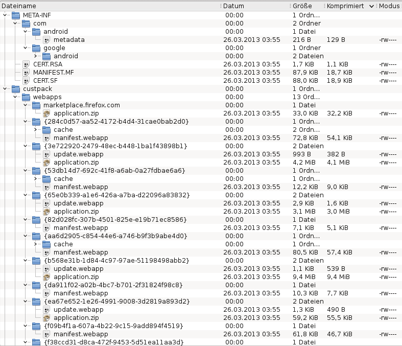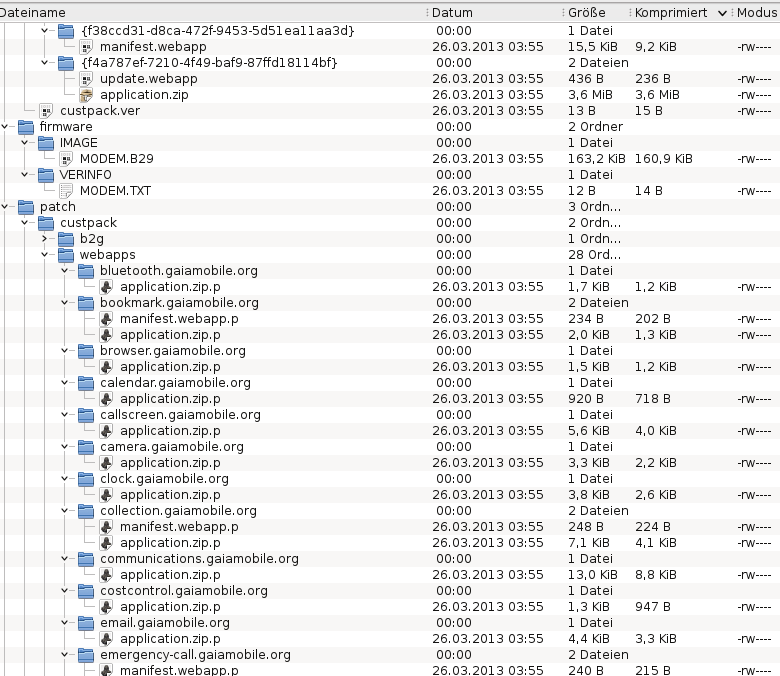 Wenn ich versuche, auf dem Smartphone die Datei update.zip zu öffnen, meldet der Datei-Manager auf dem Alcatel, "Diese Datei kann nicht geöffnet werden". Unter openSUSE kann die Datei update.zip geöffnet werden und im Dateiverzeichnisses des Archives haben alle Dateien den Zeitstempel "26.03.2013, 03:55" (siehe Anhänge).