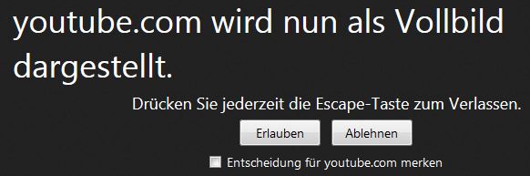 ... Nervmitteilungen: "Sie befinden sich jetzt im Vollbildmodus! Entscheidung merken?", "Das Fenster wird jetzt im Vollbildmodus gezeigt!" & (bei Mauszeigerberührung am oberen Rand) "Sie befinden sich im Vollbildmodus!"