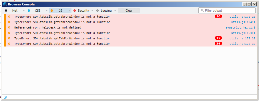 Rufe eine Seite zum Testen auf. Dann wechsle zur Browserkonsole. Oben befinden sich fünf Buttons für Meldungskategorien. Schalte die JS-Meldungen ein und die anderen aus. Dann lösche alles Angezeigte mit Klick auf "Leeren". Dann klicke im Hauptfenster auf "JS-Link in neuem Tab öffnen". Stehen nun Meldungen in der Konsole?