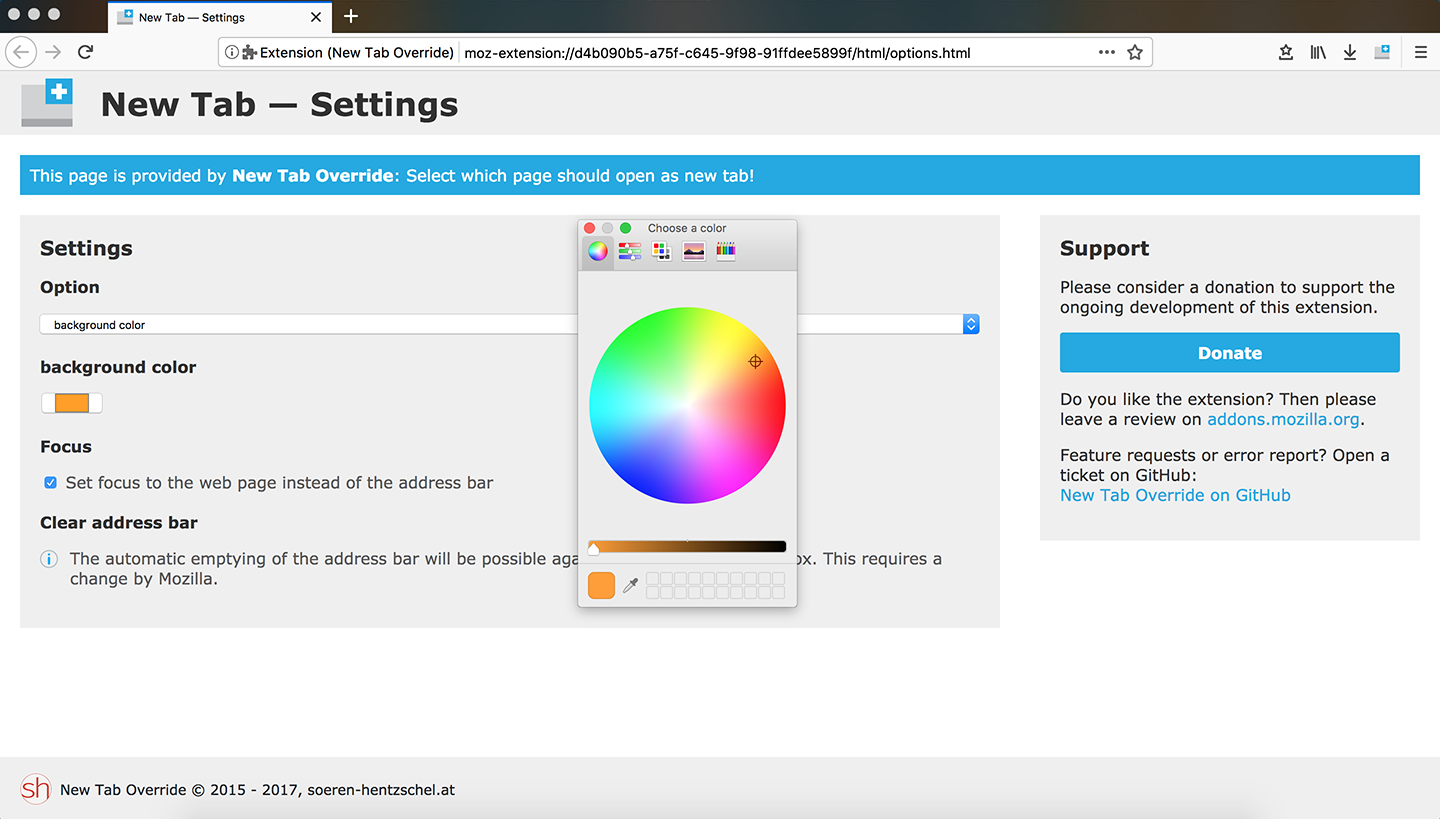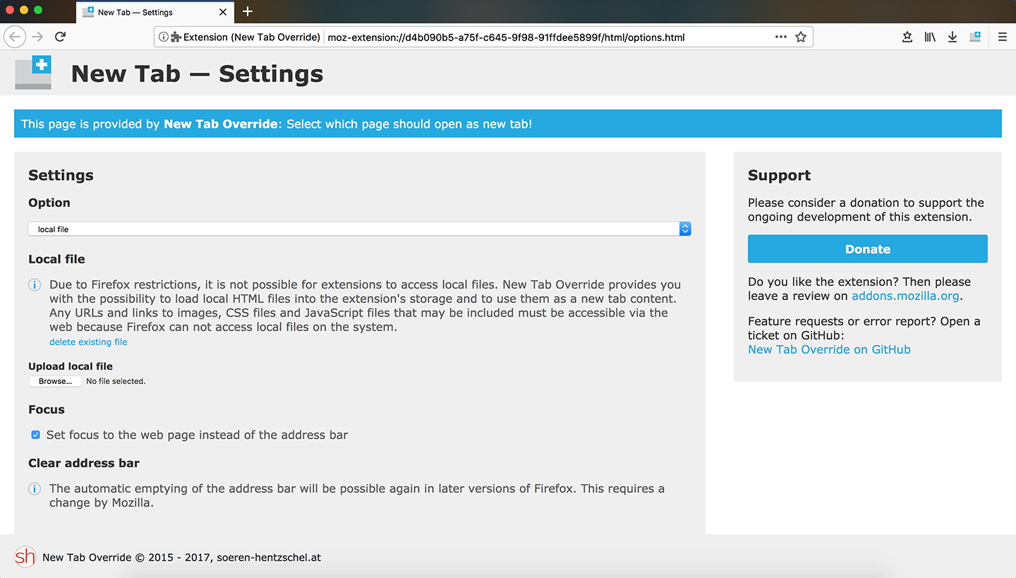 ZitatNew Tab Override ist meine Lösung zum Ersetzen der Seite, welche beim Öffnen eines neuen Tabs in Firefox erscheint. Bei mittlerweile um die 120.000 Nutzern stellt sich natürlich die Frage: wird es eine WebExtension geben, welche auch mit Firefox 57 und höher kompatibel sein wird? Die Antwort ist: Ja. Und mit diesem Artikel möchte ich eine erste Vorschau geben, welche zeigt, dass sich New Tab Override auch in Zukunft nicht auf das absolute Minimum beschränkt, sondern weiter denkt. Diese Vorschau gibt einen Einblick auf die Nutzung des neuen Berechtigungs-Systems von Firefox, welches dem Nutzer die volle Kontrolle gibt.