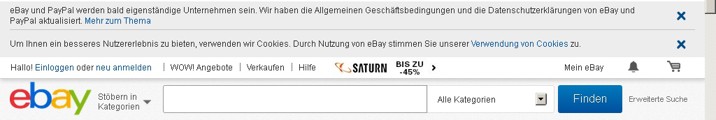 auf eBay werden dem Nutzer derzeit zwei Banner angezeigt, die auf die Verwendung von Cookies, sowie die zukünftige Trennung von eBay und Paypal hinweisen: