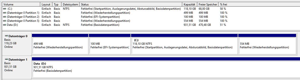 Poste einfach mal so wie 2002Andreas ein Bild der Datenträgerverwaltung; die Wiederherstellungspartition ist mangels Laufwerksbuchstaben normal unsichtbar...